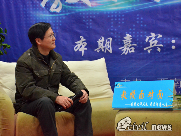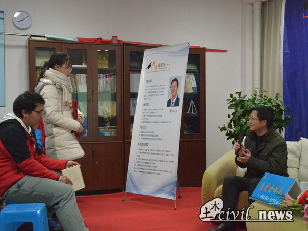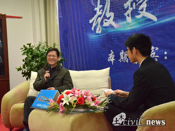 七点半,在简单介绍教授学术方面的成就后,主持人宣布活动正式开始。主持人与教授交谈的第一个问题是有关桥梁与隧道工程知识的。在场很多大一新生对这方面了解甚少,教授生动形象地举出生活中我们能够接触到的桥梁工程例子,让大家从熟悉的角度对这方面有了一定认识。这个学期,教授除了潜心于科研,还为我们大一学生兼授图学。教授目前致力于土木工程结构软件的开发与技术的研究,他讲到目前我们在图学方面所掌握的知识是远远不够的,这里面还有很大的挖掘空间,需要同学们去探索发现。