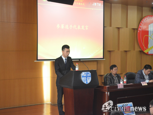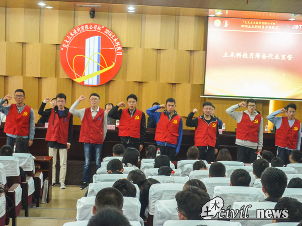参赛选手代表2015级邓宇航同学随后上台发言,他向大家分享了自己两次参加土木科技月过程中的苦与乐,他说“唯有亲身经历过才能体会到土木科技月的魅力”,字字句句中流露出对土木科技月赛事的深厚感情。随后Vwin德赢唯一官方网站大学生科创中心的同学们站在台前齐声宣誓,保证在比赛期间为同学们提供高效优质服务确保赛事的顺利进行,让大家感受到了科创人的热情与满满活力。