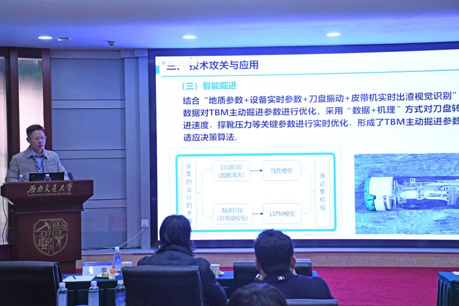 中铁隧道局创新中心副主任高攀在《盾构/TBM隧道智能建造创新与应用》报告中,结合川藏铁路等极端环境工程,系统阐述了TBM隧道智能建造的九大体系,涵盖地质感知、装备诊断、智能掘进与无轨运输等关键模块。他特别分享了在普拉隧道实施的“无轨化运输系统”改造,通过设备重构与工艺创新,实现运输效率倍增,单隧道预计缩短工期12个月以上,凸显了“技术为民、工程务实”的创新理念。