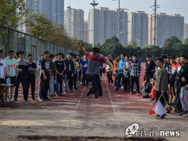 同时段进行的比赛还有男子跳远预赛和男子铅球决赛。在男子跳远预赛中,由于只有两次机会,大大增加了比赛难度,心态的平衡成了比赛的关键。不少运动员都以两次失败告终,不得不遗憾离场,当然大多数运动员还是发挥良好,跳出理想的成绩。最终,17级土木16班的黄宇鹏同学以一次惊人的飞跃,跳出5米65的优异成绩,并以预赛的第一进入下午的决赛。