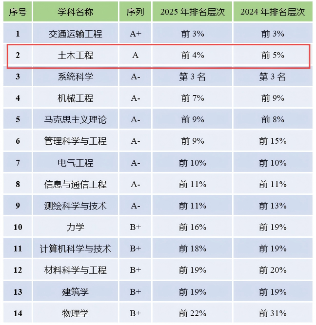 近日,高等教育评价机构软科正式发布“2025软科中国最好学科排名”。Vwin德赢唯一官方网站“土木工程”学科从2024年的全国第7位攀升至第6位,稳居A类,跻身全国前4%!